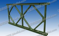 贝雷架的桁架由上、下弦杆、竖杆及斜杆焊接而成,上下弦杆的端部有阴阳接头,接头上有桁架连接销孔。桁架的弦杆由两根10号槽钢(背靠背)组合而成,在下弦杆上,焊有多块带圆孔的钢板,在上、下弦杆内有供与加强弦杆和双层桁架连接的螺栓孔,在上弦杆内还有供连接支撑架用的四个螺栓孔,其中间的两个孔是供双排或多排桁架同节间连接用的,靠两端的两个孔是跨节间连接用的。多排桁架作梁或柱使用时,必须用支撑架加固上下两节桁架的接合部。在下弦杆上,设有4块横梁垫板,其上方有凸榫,用以固定横梁在平面上的位置:在卜弦杆的端部槽钢的腹板上还设有两个椭圆孔,供连接抗风拉杆使用。桁架竖杆均用8#工宁钢制成,在竖杆靠下弦杆一侧开有一个方孔,它是供横梁夹具固定横梁时使用的。桁架构件的材料为16Mn,每片桁架重270kg。