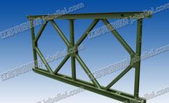 桁架片的弦杆是由两根10号槽钢(背靠背)组合而成,在下弦杆上,焊有多块的带圆孔的钢板,在上、下弦杆内有供和加强弦杆和双层桁架片连接的螺栓孔,在上弦杆内还有供连接支撑架用的四个螺栓孔,其中间的两个孔是供双排或多排桁架片同节间连接用的,靠两端的两个孔是跨节间连接而用的。多排桁架片作梁或柱使用时,必须用支撑架加固上下两节桁架片的接合部。
