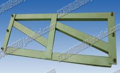 在下弦杆上,设有4块横梁垫板,其上方有凸榫,用以固定横梁在平面上的位置,在下弦杆的端部槽钢腹板上还设有两个椭圆孔,供连接抗风拉杆使用。贝雷片竖杆均用8#工字钢制成,在竖杆靠下弦杆一侧开有一个方孔,它是供横梁夹具固定横梁使用的。贝雷片的材料为16Mn,每片架重270kg。